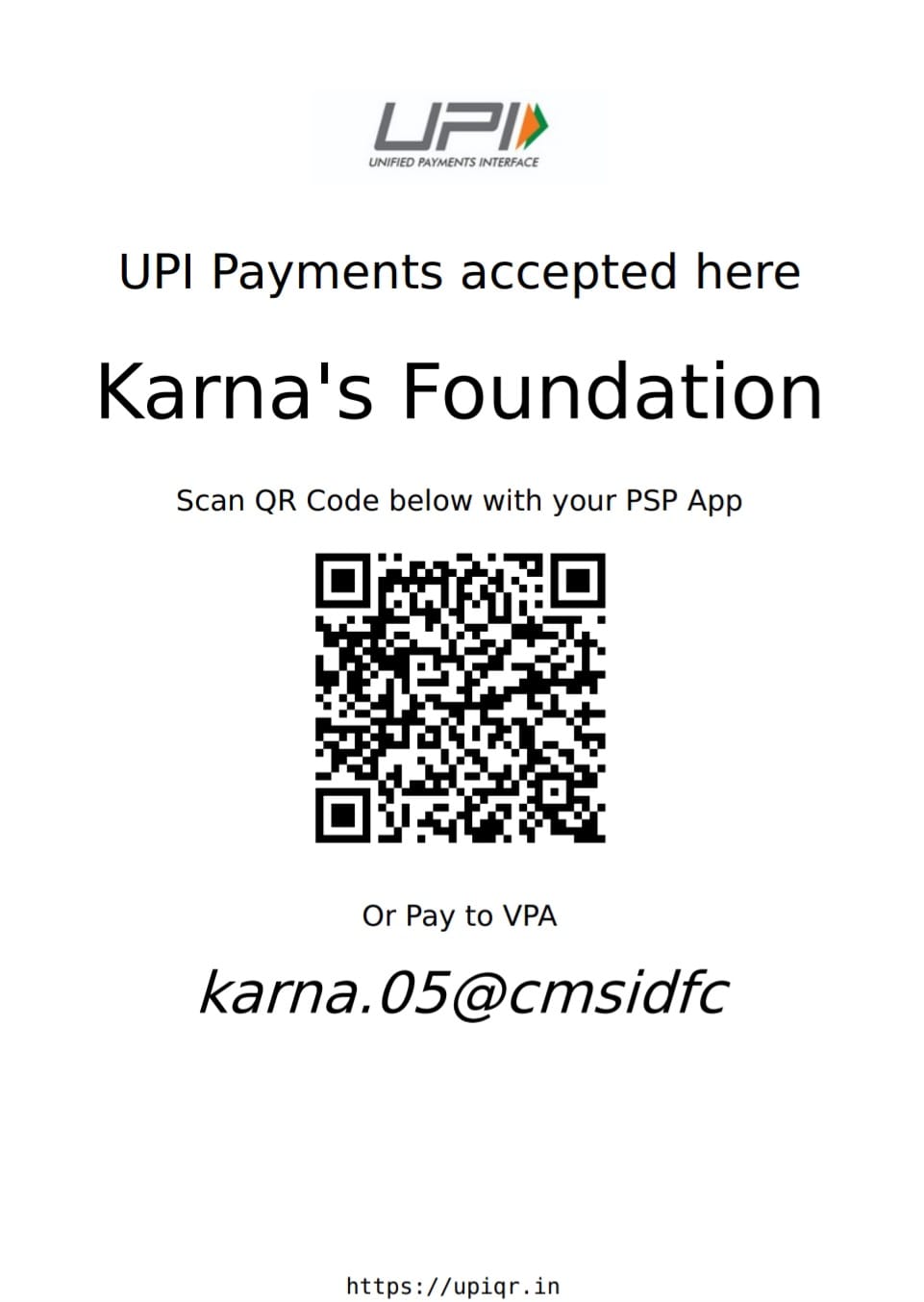 UPI DETAILS KARNA'S FOUNDATION * :